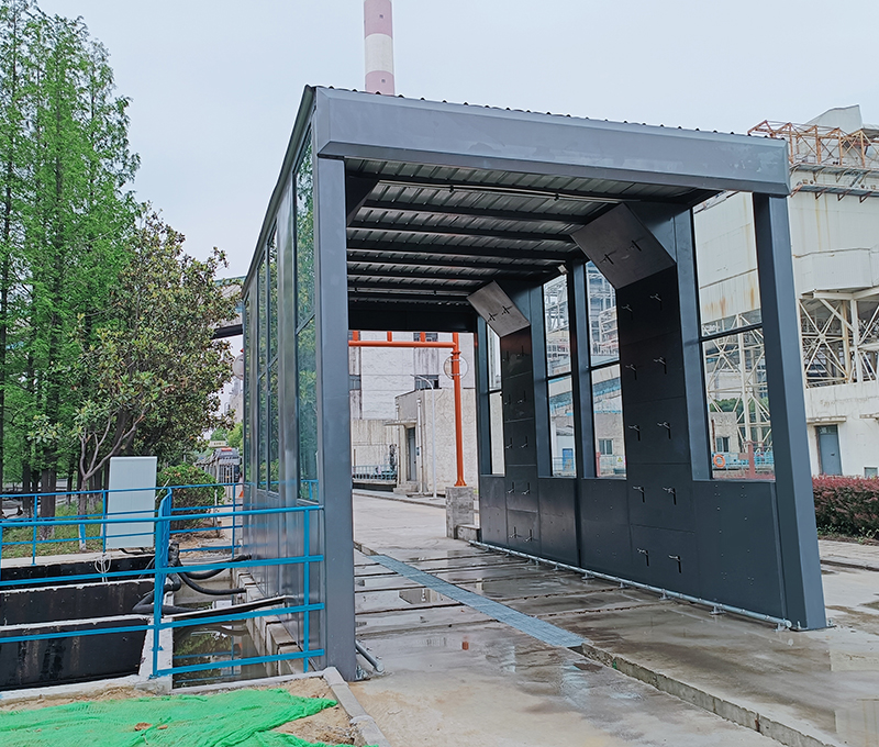 2、車輛緩慢向前移動,進(jìn)入循環(huán)水沖洗平臺區(qū)域,高壓水噴嘴對車輛輪胎、底盤、兩側(cè)、進(jìn)行徹底清洗。沖洗時間一般40~120s,根據(jù)實際沖洗效果控制車輛行駛速度來控制沖洗時間。